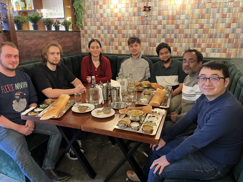 Hou Group Christmas Meal 2025 at Crispy Dosa Restaurant Cardiff 12 Dec 2025: (from left to right) Will, Szymon, Serena, Tolga, Sri, Chandra and Bo.